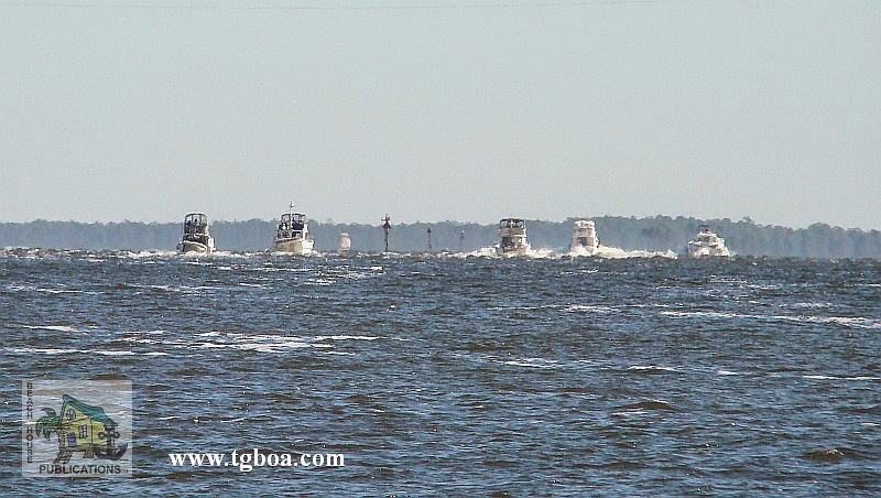After 10 days in Apalachicola and a great Thanksgiving celebration with all of the other boaters, the break we had all been waiting for finally came. The gale force winds in the Gulf subsided, the waves returned to manageable levels, the rain stopped and the sun finally came back. On Friday morning there was a mass exodus as the parade of vessels made their way under the highrise bridge and out into St. George Sound. The faster boats quickly disappeared on the horizon and the more conservative boats stayed in the marked channel, avoiding any shortcuts. Beach House has never been known for rigidly following every channel unless there is no other choice. While some boats added miles by transiting all the way out the Apalachicola approach channel, we turned off and headed across the Bay, shaving several miles off the day's run. If there is enough depth for our draft, we will take any shortcut available.